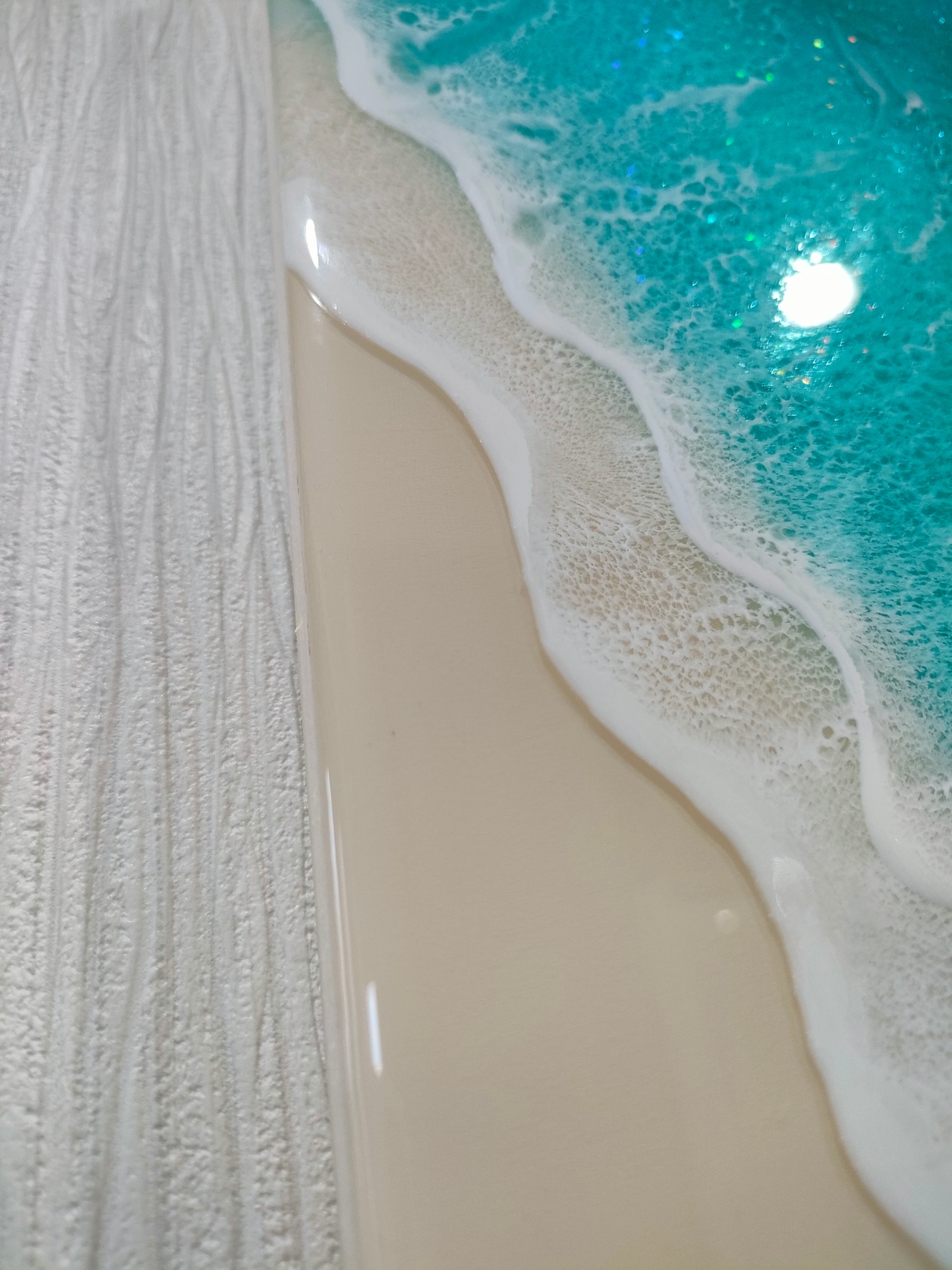 西海岸の海をイメージし、エメラルドグリーンとブルーのグラデーション、繊細な波模様を再現しました。